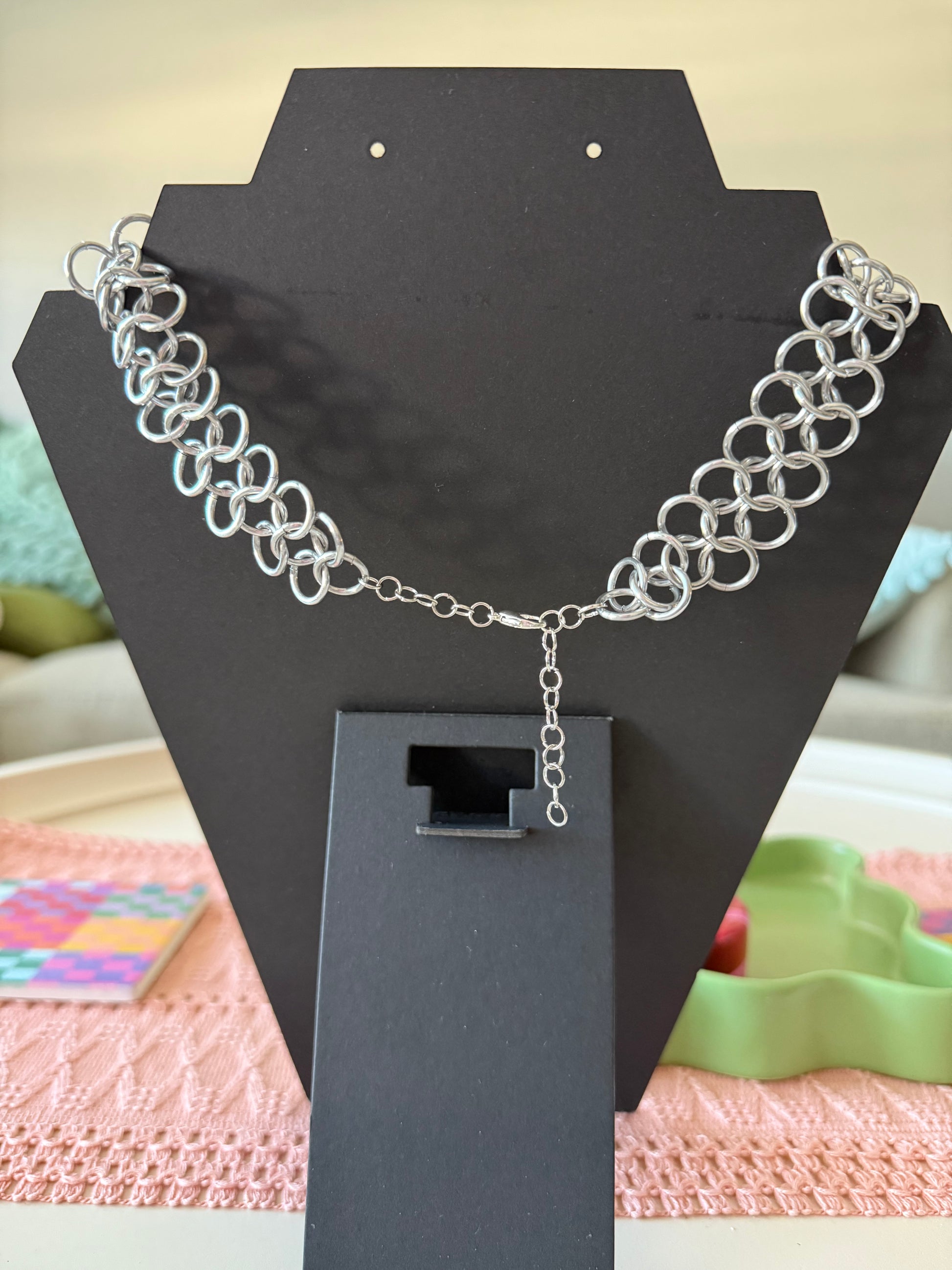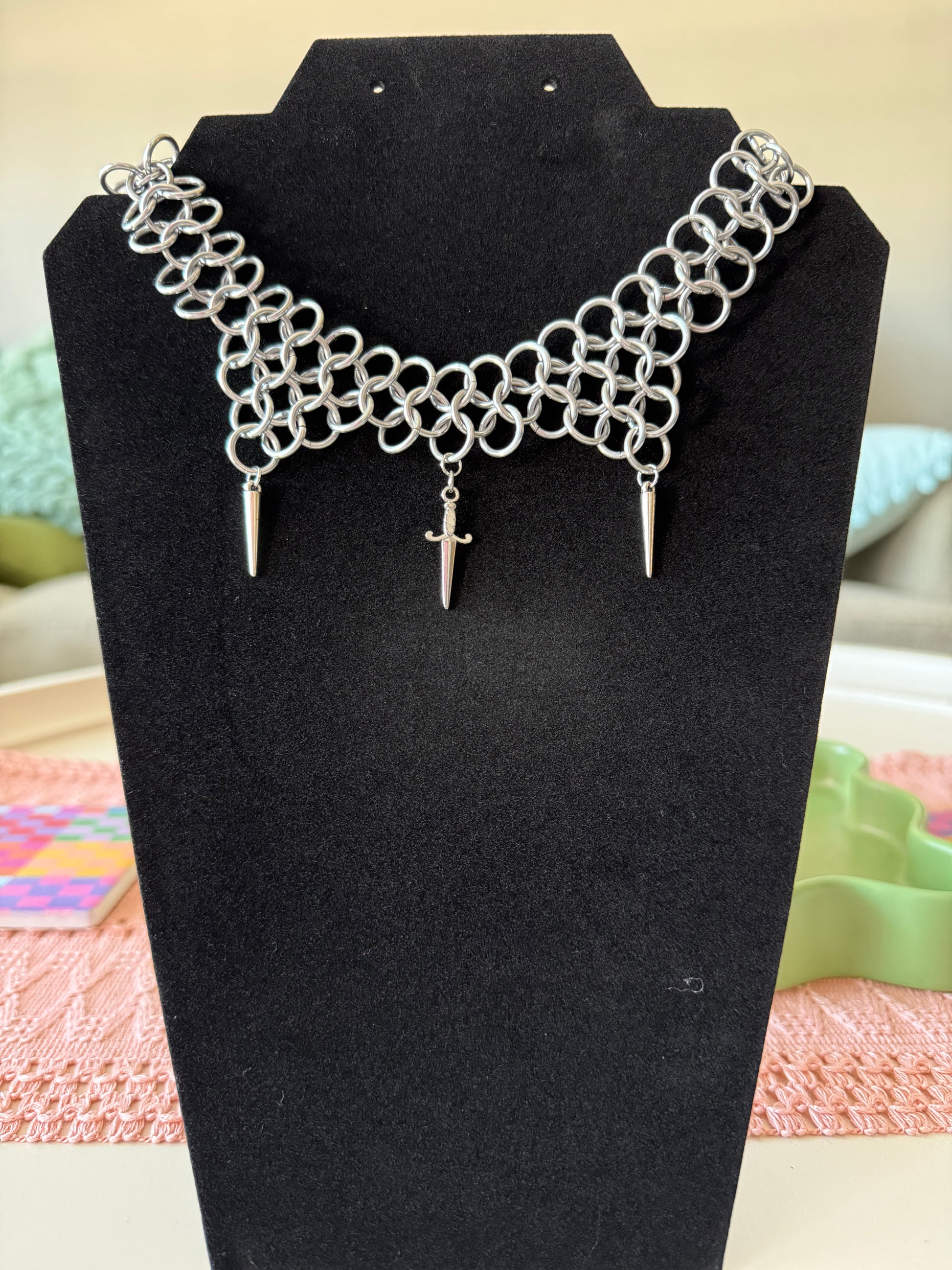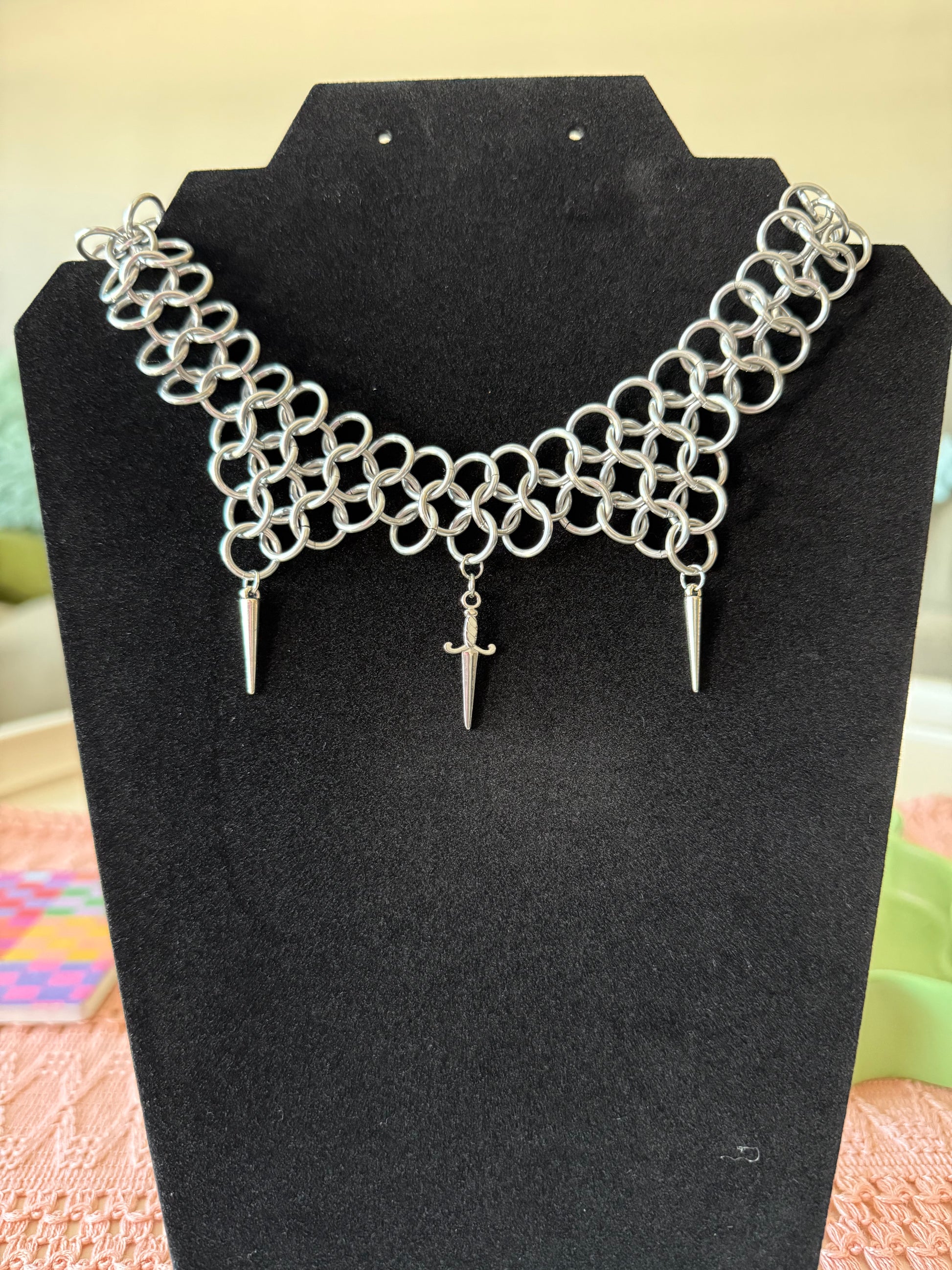 Handmade chainmaille necklace made of aluminum rings with 2 spikes and a sword! Clasp and small jump rings on the back are silver. Made to fit as a choker/shorter necklace.