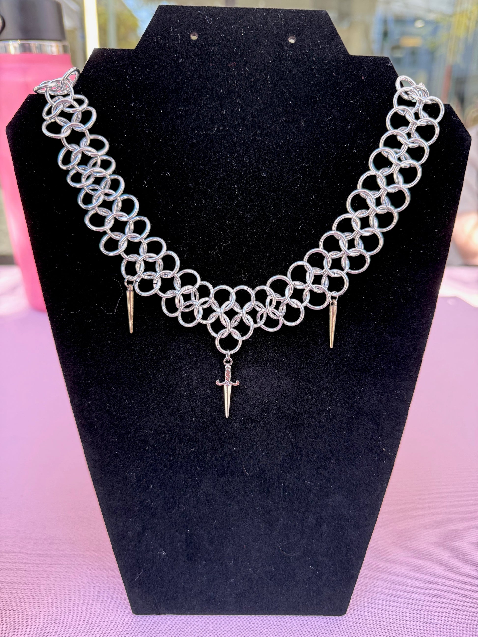 Handmade chainmaille necklace made of aluminum rings with a silver sword pendant and 2 spikes! Clasp and small jump rings on the back are silver. Made to fit as a choker/shorter necklace.