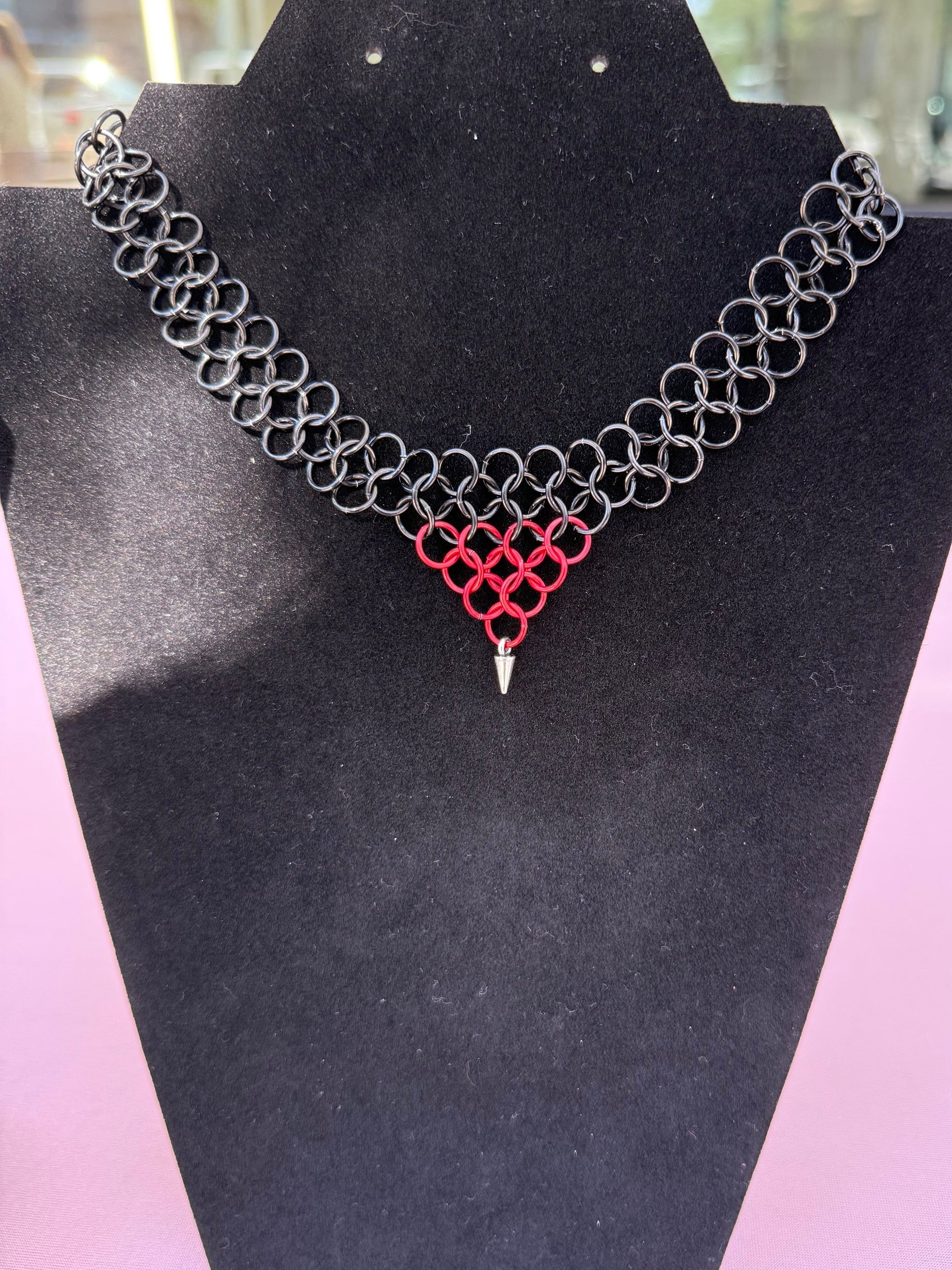 Handmade chainmaille necklace made of red and black rings, finished with a dainty silver spike! Clasp and small jump rings on the back are silver. Made to fit as a choker/shorter necklace.