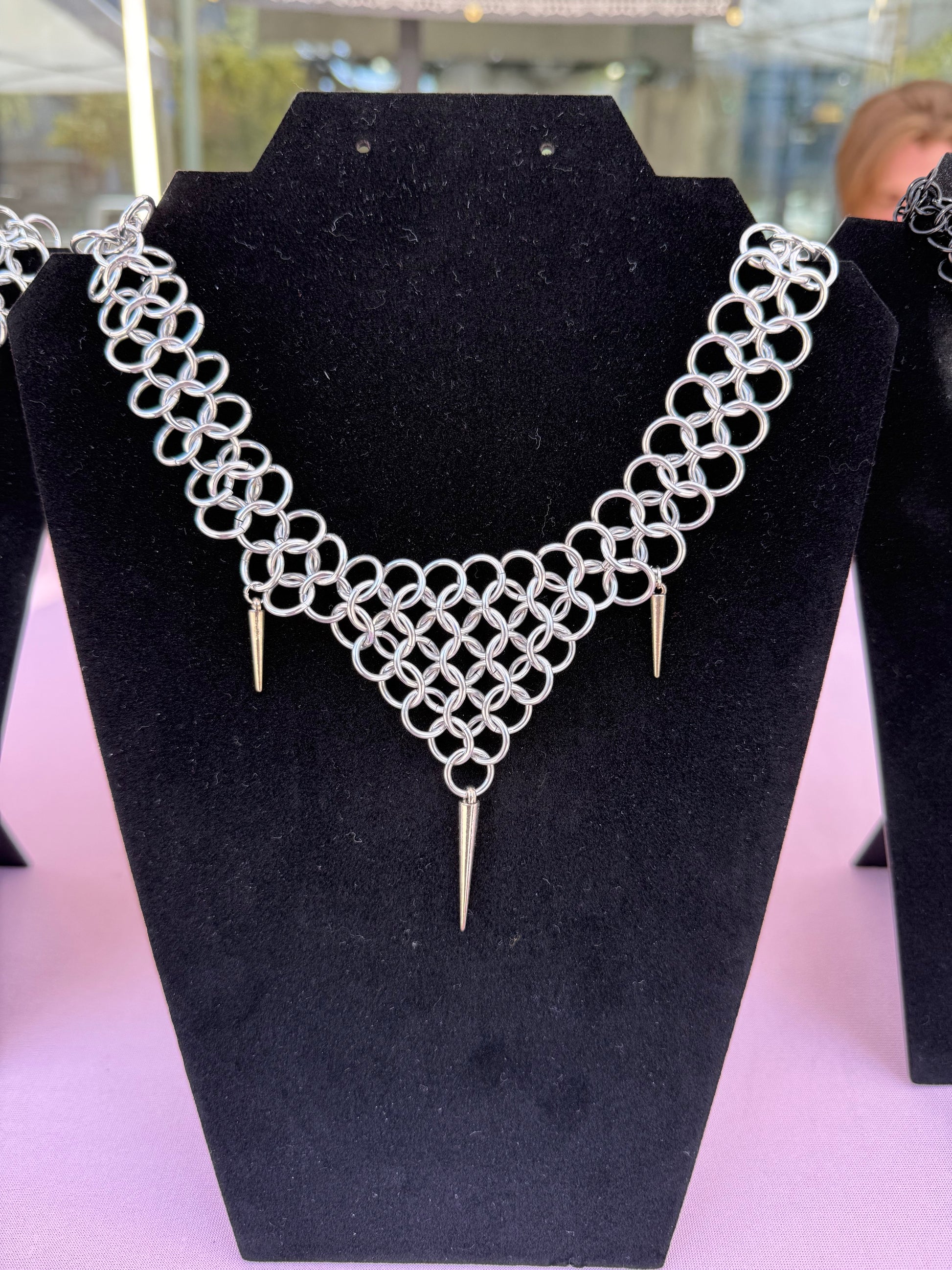 Handmade chainmaille necklace made of aluminum rings with 3 spikes! Clasp and small jump rings on the back are silver. Made to fit as a choker/shorter necklace.